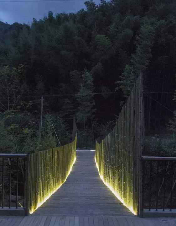 最終,在余姚中村小溪上架起的這座竹橋,僅花了 2.6 萬,其中 2.1 萬人工費,5000 元材料費。它造價低廉卻質樸優美,僅有 1.2 米的橋身剛好是足夠一人走、另一個人側身而過的尺度,到了晚上,小橋上安裝的燈帶散發著微光,為它增添了一分別樣的美感。